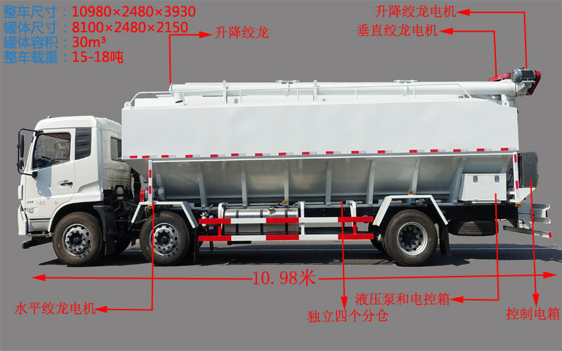 液壓式散裝飼料車的飼料罐架設在卡車的底盤上,專用設施由罐體總成、輸送系統(水平卸料系統、垂直卸料系統以及活動卸料系統組成)、液壓系統(高壓油泵經管路與分配閥連接該閥的三個輸出端分別是轉角液壓馬達、升降油缸以及串聯在一起的水平卸料、垂直卸料、活動卸料液壓馬達)、電動系統、氣動分倉機構等組成。在罐體底部設有閘門,在閘門下面裝有水平螺旋輸送器(俗稱水平攪籠),由取力器由汽車變速箱輸出動力驅動,再傳動高壓油泵以驅動液壓系統,液壓馬達通過傳動裝置帶動水平螺旋輸送器的葉片軸及葉片旋轉, 經活動輸送系統(俗稱活動攪籠)以將飼料輸出。車頂平置的一根活動卸料絞龍可自由回轉和抬升,運輸時,頂部的螺旋管平臥在罐頂;卸料時則抬起,使管端的出料口與畜禽飼養場貯料罐頂部的進料門相接、對準,完成卸料。電動絞龍散裝飼料運輸車是針對不同客戶群最新研發的、滿足低端市場的新產品,該車不配車載發電機,電動絞龍利用市電三相380V來供電,車輪距較小能適應農村鄉間道路。該車性價比高很受客戶的青睞,適用于路況狹小的小型養殖場、飼料廠。采用機械螺旋的卸料方式,卸料速度快,可連續作業,大大提高生產效率。罐體可分隔成二至四倉,同時裝載不同飼料;各部件結構簡單,操作方便靈活,易于維修保養。