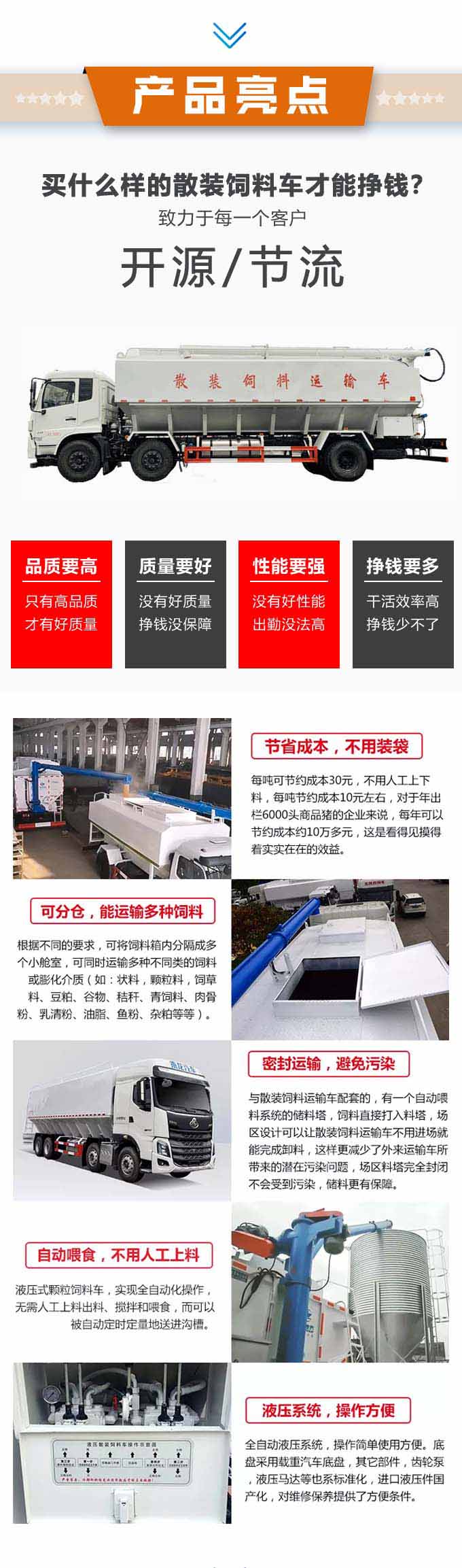 液壓式散裝飼料車的飼料罐架設在卡車的底盤上,專用設施由罐體總成、輸送系統(水平卸料系統、垂直卸料系統以及活動卸料系統組成)、液壓系統(高壓油泵經管路與分配閥連接該閥的三個輸出端分別是轉角液壓馬達、升降油缸以及串聯在一起的水平卸料、垂直卸料、活動卸料液壓馬達)、電動系統、氣動分倉機構等組成。在罐體底部設有閘門,在閘門下面裝有水平螺旋輸送器(俗稱水平攪籠),由取力器由汽車變速箱輸出動力驅動,再傳動高壓油泵以驅動液壓系統,液壓馬達通過傳動裝置帶動水平螺旋輸送器的葉片軸及葉片旋轉, 經活動輸送系統(俗稱活動攪籠)以將飼料輸出。車頂平置的一根活動卸料絞龍可自由回轉和抬升,運輸時,頂部的螺旋管平臥在罐頂;卸料時則抬起,使管端的出料口與畜禽飼養場貯料罐頂部的進料門相接、對準,完成卸料。電動絞龍散裝飼料運輸車是針對不同客戶群最新研發的、滿足低端市場的新產品,該車不配車載發電機,電動絞龍利用市電三相380V來供電,車輪距較小能適應農村鄉間道路。該車性價比高很受客戶的青睞,適用于路況狹小的小型養殖場、飼料廠。采用機械螺旋的卸料方式,卸料速度快,可連續作業,大大提高生產效率。罐體可分隔成二至四倉,同時裝載不同飼料;各部件結構簡單,操作方便靈活,易于維修保養。